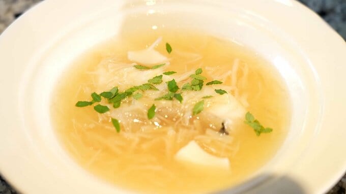「クエの酒蒸しでございます。長崎県のクエを酒蒸しにして、上からショウガと干し貝柱のあんをかけております」