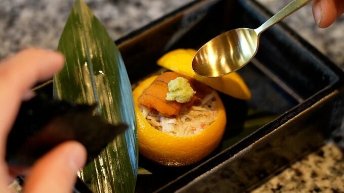 「柚子釜寿司でございます。下がシャリになっていまして、上が北海道の毛ガニ、その一番上が北海道のウニ、これを5分ぐらい蒸し寿司にしまして」
