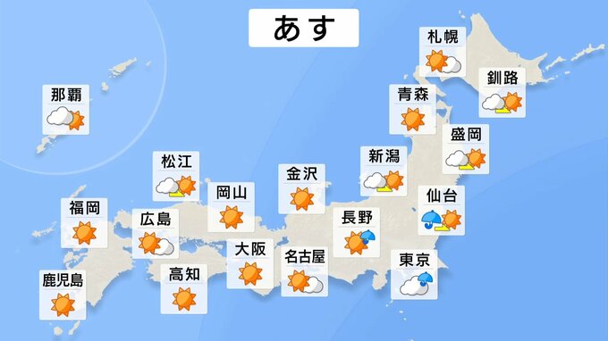 あすは雨をもたらした低気圧や前線が陸地から離れ、代わりに高気圧が張り出してくる見込みです。日中は全国的に晴れて青空が広がるでしょう。