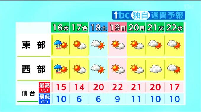 向こう一週間、高気圧に覆われて晴れる日が多いでしょう。最高気温は、平年より高い日が多く、日曜の日中は、5月下旬並みまで上がる見込みです。