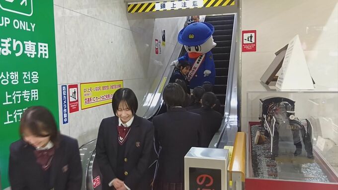 県警のマスコット「ぱとこちゃん」も協力して盗撮の手口の実演も行われ、生徒たちは「盗撮はスマートホンが多い」とか「カバンに小型カメラが仕込まれていることもある」など説明を受けました。