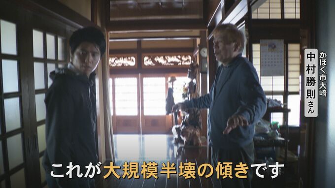 中村勝則さん(64)「こんな感じです、今上がってきて分かりました?」「傾いていますよね?」「これが大規模半壊の傾きです、ずれて傾いているという感じ」