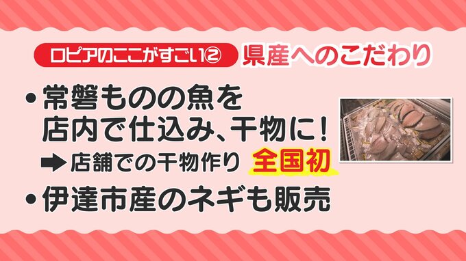 2つ目は、「県産食材へのこだわり」。コイ、いかにんじん、円盤餃子、クリームボックスなど、福島の名物を使った独自の商品が多く販売されています。そのほか、干物は、常磐ものの魚を店内で仕込んでいて、店舗での干物づくりは、全国初の取り組みとなっています。そのほか、伊達市のネギも販売されていました。