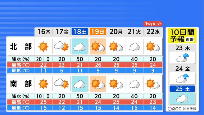 金曜日もおおむね晴れるでしょう。土曜日はすっきりせず、雲が広がりやすいでしょう。ただ晴れ間が期待できるかもしれません。日曜日と月曜日はおおむね晴れる予想です。南部では最低気温が15℃前後で朝晩の冷え込みも緩んでくるでしょう。そろそろ衣替えを進めていきましょう。