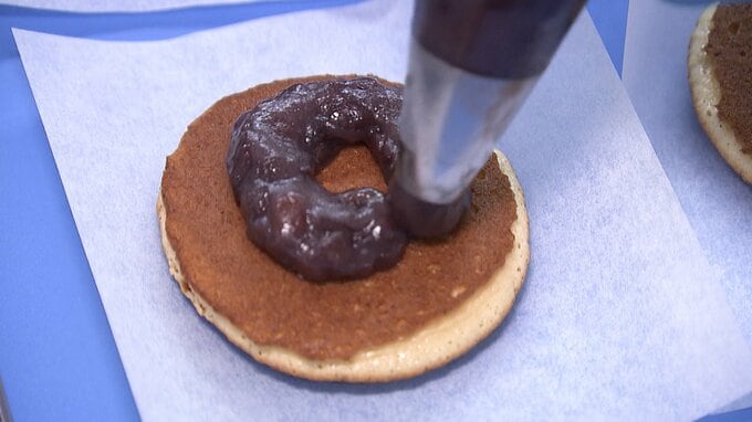 出来立てをその場で味わえる実演店舗も16店あります。その一つが、会場限定の宗家源吉兆庵が手がけるどら焼き。このために作り上げたふんわりとした生地に、北海道産の小豆を使用した粒あんが包まれています。