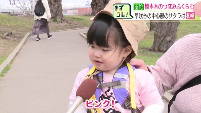 「五稜郭公園の標本木です。枝の先を見てみると、ピンク色のつぼみがどんどん大きくなってきています」