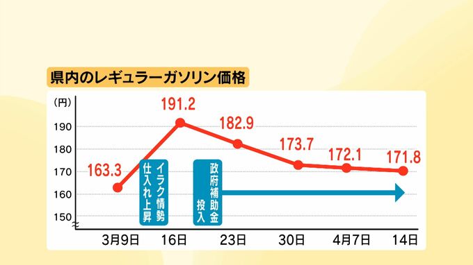 中東情勢の緊迫による原油価格の高騰を受けて、県内のガソリン価格は先月一気に30円近く急上昇しましたが政府が先月19日から始めた元売り各社への補助金の効果で翌週以降4週連続で値下がりしています。
