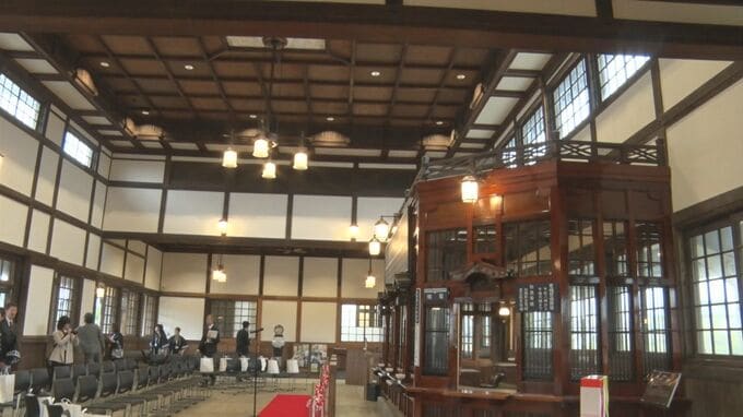 天井が高く広々とした三等待合室や、レトロな格子窓の切符売り場など、総事業費12億5000万円をかけ、見事に復元されました。
