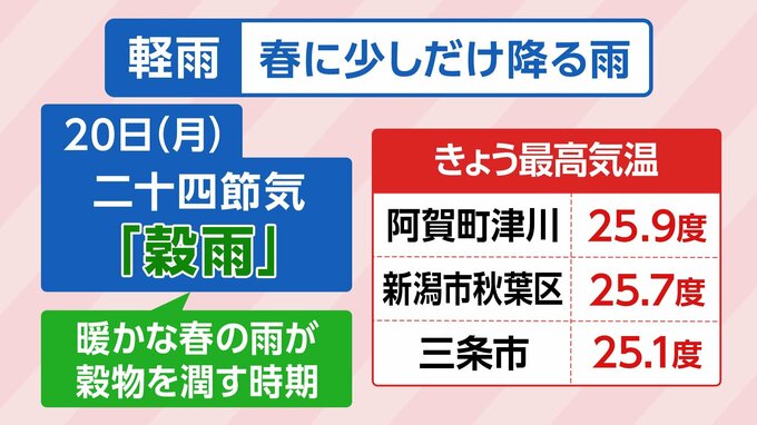 20日は、1年の暦を24つに分けた“二十四節季”の『穀雨』にあたりますが、これは、“暖かい春の雨が穀物を潤す頃”という意味です。