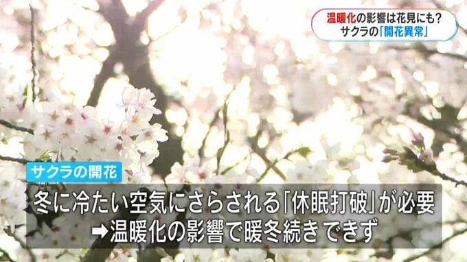 サクラの開花には冬の間に一定期間冷たい空気にさらされる「休眠打破」が必要ですが、近年地球温暖化の影響で暖冬が続き、休眠打破が出来なかったことが要因とされています。