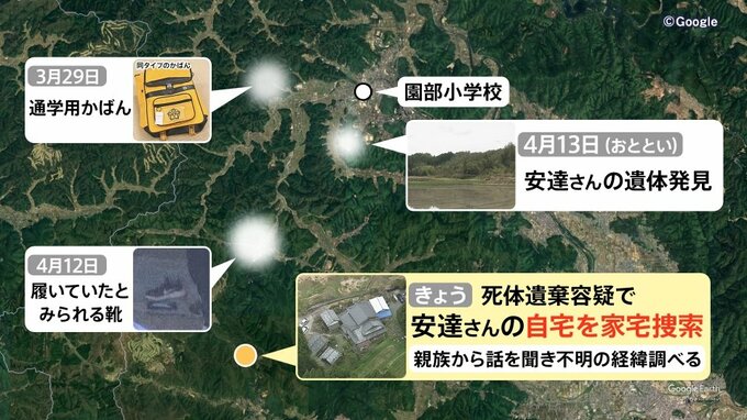 ▼4月15日 死体遺棄容疑で安達さんの自宅を家宅捜索(親族から話を聞き不明の経緯調べる)