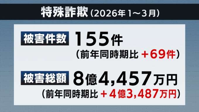 2026年に入ってからも3月までの被害件数は155件、被害総額はおよそ8億4000万円に上っていて、去年の同じ時期と比べ大幅に増えています。