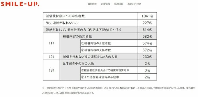 公式サイトでは「補償を行わない旨の連絡をした230名の方は、ご提出いただいた資料の検証および弊社代理人によるヒアリングの結果、弊社への在籍および被害のいずれの事実も確認できなかった方です。」と、投稿。