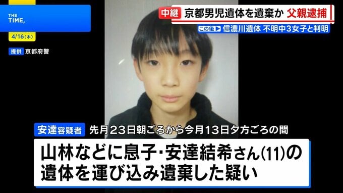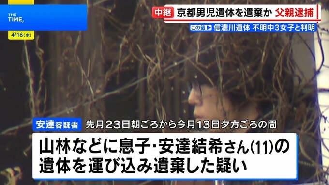 【速報】父親を死体遺棄容疑で逮捕 安達結希さんが遺体で見つかった事件 京都・南丹市 TBSテレビ 2026年4月16日(木) 01:17 国内 15日には死体遺棄の疑いで安達結希さんの自宅を家宅捜索 この事件をめぐっては警察が15日、安達結希さんの自宅を死体遺棄の疑いで家宅捜索していました。