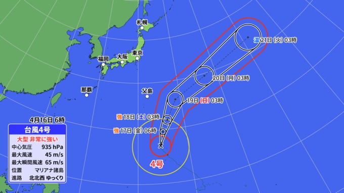 気象庁によりますと、大型で非常に強い台風4号は、16日6時にはマリアナ諸島にあって、北北西にゆっくり進んでいます。中心の気圧は935ヘクトパスカル、中心付近の最大風速は45メートル、最大瞬間風速は65メートルです。