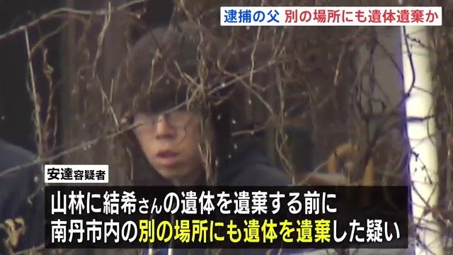 逮捕の父親「事前に別の場所にも遺体遺棄」か 京都・南丹市の安達結希さん遺体で発見 「私のやったことに間違いありません」安達優季容疑者(37)が供述 To view this video please enable JavaScript, and consider upgrading to a web browser that supports HTML5 video 毎日放送 2026年4月16日(木) 09:53 国内 逮捕された父親の安達優季容疑者(37)「事前に別の場所にも遺棄」か 京都府南丹市の山林で行方不明となっていた男子児童が遺体で見つかった事件で、逮捕された父親は、山林に遺棄する前に別の場所にも遺体を遺棄した疑いがあることが新たにわかりました。