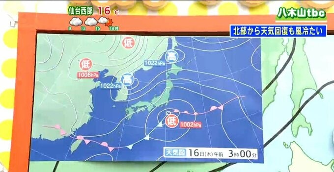 16日午前3時の天気図では、宮城県内は本州の南を東に進む低気圧の影響で雨が降っていました。この低気圧はこのあとまっすぐ東へ離れ、北のほうから高気圧が覆ってくることで、天気はゆっくりと回復傾向に向かいます。一方で、高気圧と低気圧の間で等圧線の間隔が狭くなるため、北東の風が強まる見込みです。