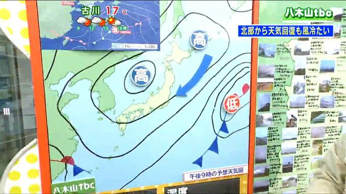 北東の風と、山形方面から吹いてくる北西の風が県の南西部でぶつかるような形になり、南部の山沿いでは昼過ぎから夕方にかけてにわか雨が予想されます。少し大粒の雨が降ることもあるかもしれません。