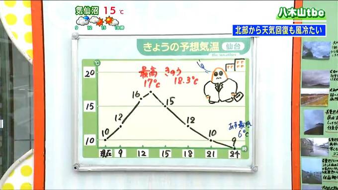 仙台の予想気温は日中17℃前後まで上昇し、夜間にかけて急降下します。