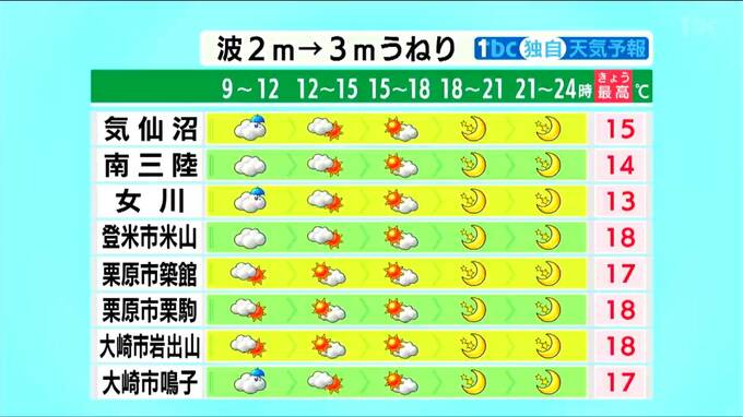 海上では波がうねりを伴い3メートルまで高くなる見込みで、17日にかけて高波に注意してください。17日の朝の最低気温は気仙沼で2℃まで下がる予想です。