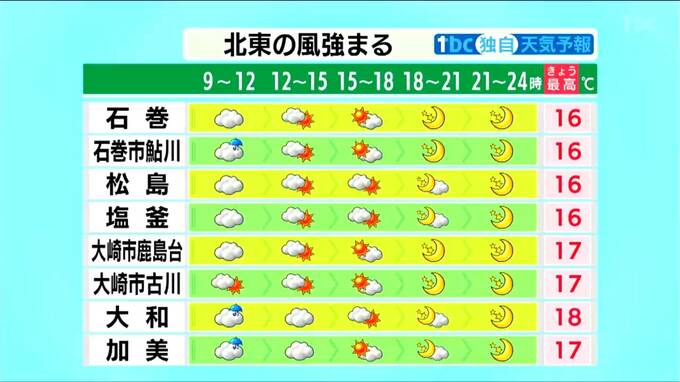 日中はいったん晴れ間も出て、最高気温は仙台で17℃まで上がる予想でほぼ平年並みとなりそうです。ただし三陸沿岸では海風の影響で最高気温は14℃程度にとどまります。
