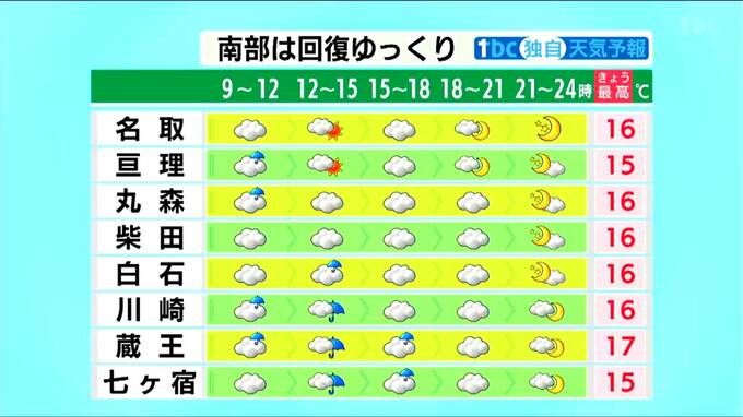 白石の最高気温は15日より5℃低くなる見込みです。