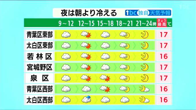 ■青葉区東部:17℃ ■青葉区西部:16℃ ■若林区:16℃