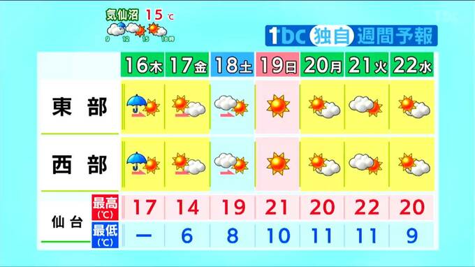 17日以降は高気圧に覆われて晴れや曇りの天気がしばらく続く見込みです。最高気温は17日が平年並みか低めですが、18日以降は暖かな空気が流れ込み、連日20℃前後が続く予想です。