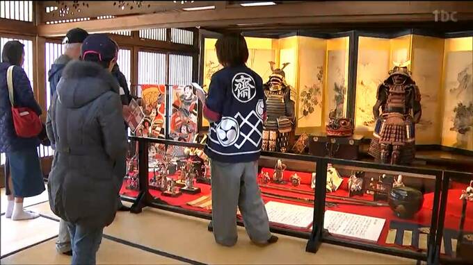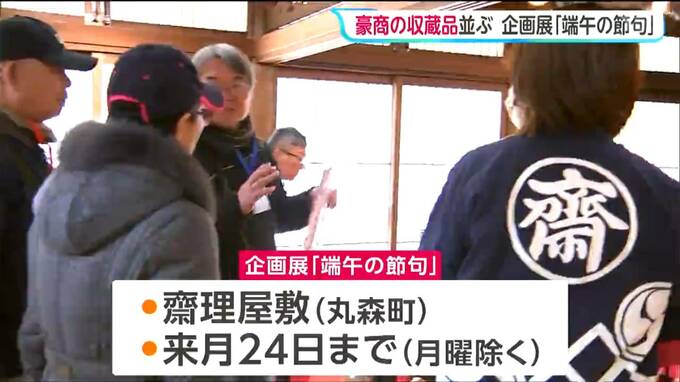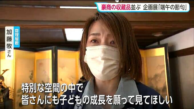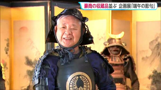 丸森町の「齋理屋敷」の大広間で開かれている企画展「端午の節句」では江戸時代から昭和にかけて栄えた豪商「齋藤家」の収蔵品から2領の鎧兜や武者のぼりなど50点あまりが並んでいます。