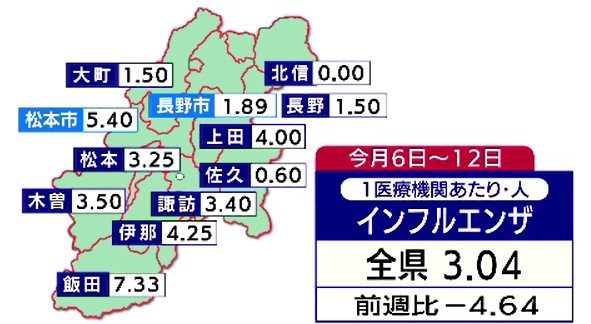 長野県内のインフルエンザの患者数は、減少傾向で全県で注意報の基準を下回りました。4月12日までの1週間の県内のインフルエンザ患者は1医療機関あたり3.04人で8週連続で減少しました。地域別では、飯田で7.33人…