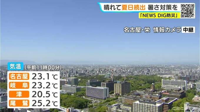 正午前の名古屋市内は青空が広がり、強い日差しが照りつけています。午前11時の気温は名古屋で23.1℃、尾鷲で25.2℃と、尾鷲では25℃を超えて夏日になっています。