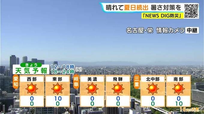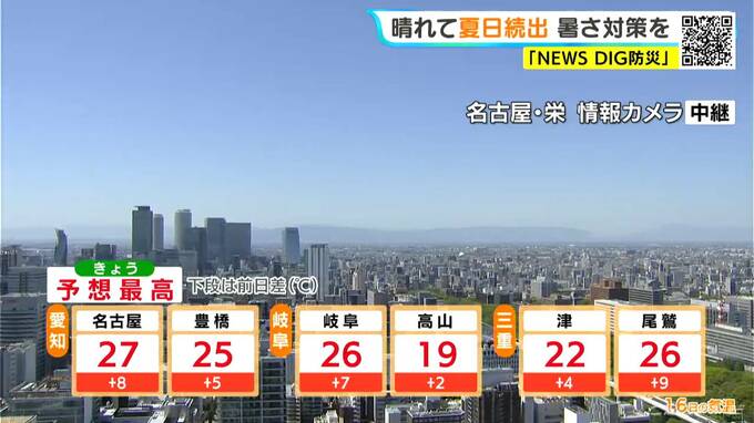 予想最高気温は名古屋で27℃、岐阜や尾鷲で26℃、豊橋で25℃と、各地で夏日になる見込みです。こまめな水分補給など、暑さ対策を心がけましょう。