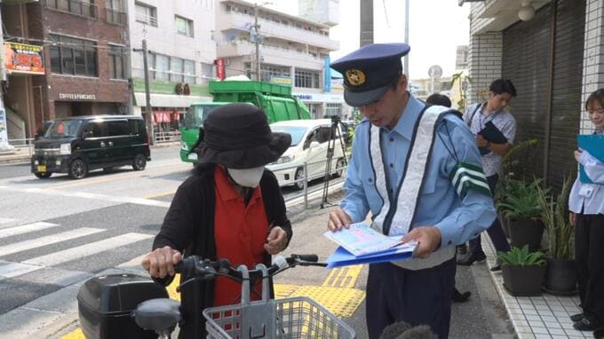 自転車の交通違反に対し反則金の納付を通告する、いわゆる「青切符」制度が今月始まったことを受け、県警が那覇市で指導取り締まりを行いました。