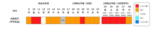 北陸地方の向こう2週間の気温は、暖かい空気に覆われやすいため高く、22日頃からはかなり高くなる見込みです。農作物の管理等に注意してください。積雪の多い地域ではなだれに注意してください。また、今後の気象情報等に留意してください。