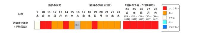 近畿地方の向こう2週間の気温は、暖かい空気に覆われやすいため高く、22日頃からはかなり高くなる見込みです。農作物の管理等に注意してください。また、今後の気象情報等に留意してください。