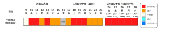 中国地方の向こう2週間の気温は、暖かい空気に覆われやすいため高く、かなり高い日が多い見込みです。農作物の管理等に注意してください。また、今後の気象情報等に留意してください。