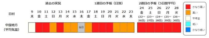 中国地方の向こう2週間の気温は、暖かい空気に覆われやすいため高く、かなり高い日が多い見込みです。