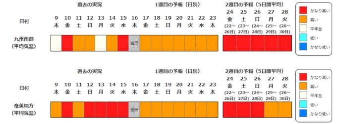 九州南部・奄美地方の向こう2週間の気温は、暖かい空気に覆われやすいため高く、22日頃からはかなり高くなる見込みです。