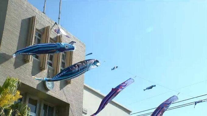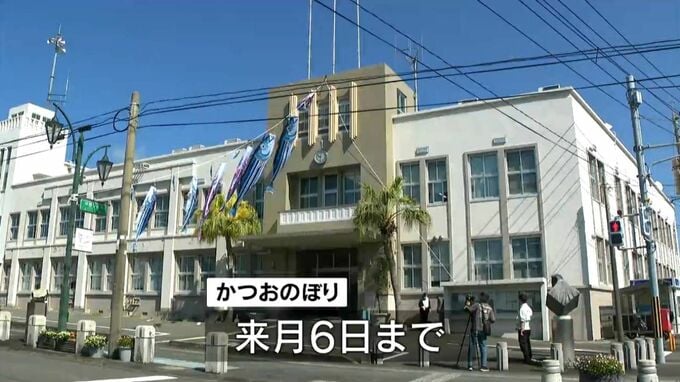 かつお節の生産量が日本一で、全国のおよそ半分のシェアを誇る枕崎市では、子どもたちの健やかな成長と水産業の振興を願って、毎年、市役所の玄関前に、「かつおのぼり」を掲げています。