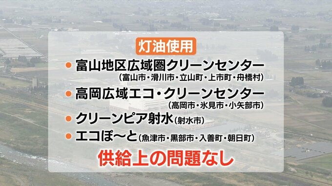 クリーンセンターとなみ以外で、富山県内の自治体や広域圏が運営するごみ処理施設4か所に尋ねたところ、いずれの施設も焼却炉の燃料には灯油を使っていて、供給上の問題はないということです。