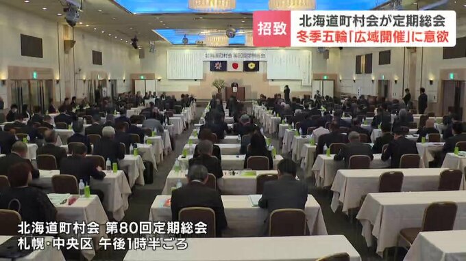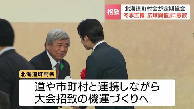 北海道町村会の定期総会が16日、札幌市で開かれ、北海道各地で行う「広域開催」を念頭に冬のオリンピック招致を目指すことを改めて確認しました。