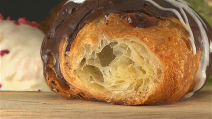 「ミルクチョコレートのまろやかな甘さが非常においしい。チョコの甘さを感じた後にバターの風味、クロワッサンの生地のおいしさを感じる。味わいの変化とサクサクのアクセントがおいしい」