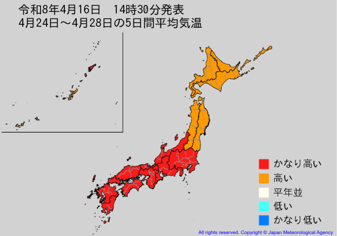 【2週間気温予報】東・西日本と奄美地方の向こう2週間の気温は高く、かなり高い日も 農作物の管理などに注意 今後の全国の天気を画像で 気象庁 テレビユー山形 2026年4月16日(木) 17:00 国内 ■4月24日~4月28日の5日間平均気温(画像) ・8日先から12日先まで5日間平均した日平均気温を表示しています。 ・かなり高い(かなり低い)は、かなり高い(かなり低い)気温となる確率が30%以上のときに表示します。