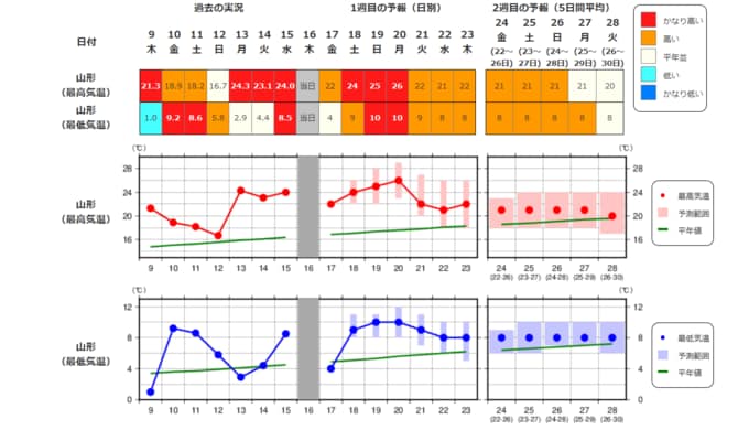 ・最近1週間の実況と今後2週間先までの気温の推移を表示しています。
