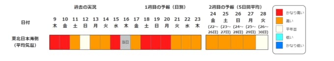 ・2週目の予報は中心の日に前後2日間を加えた5日間の平均(最高気温の5日間平均、最低気温の5日間平均、平均気温の5日間平均)です。平均期間を中心の日の下に表示しています。2週目のかなり高い(かなり低い)は、かなり高い(かなり低い)気温となる確率が30%以上のときに表示します。