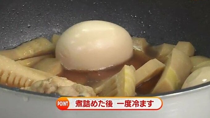 3.鍋に煮汁を合わせて火にかけ、たけのこ・手羽元・ゆで卵を入れる。