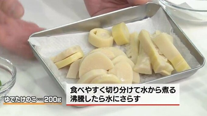 1.たけのこは、穂先の方を縦割りに真ん中と根元を半月切りにし、臭みを取り除くため水から煮立て沸騰したら水にさらす。