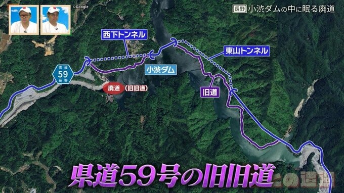小渋川の下流にある「小渋ダム」には、ダムが完成するまで使われていた県道59号の旧旧道が一部存在しています。