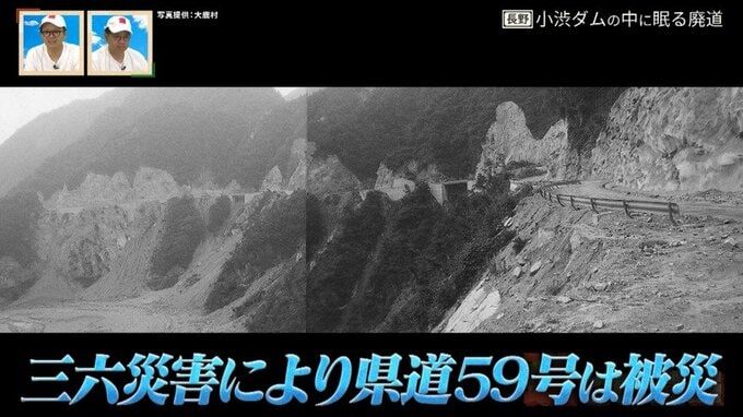 現在の県道よりもっと低い位置にあった、小渋川沿いを走る県道59号の旧旧道も、三六災害によって全線が被災。迅速な復旧が望まれましたが、すでに小渋ダムの工事計画が進んでおり、将来的には水没することが決まっていたため、新たな道路を造ることに。