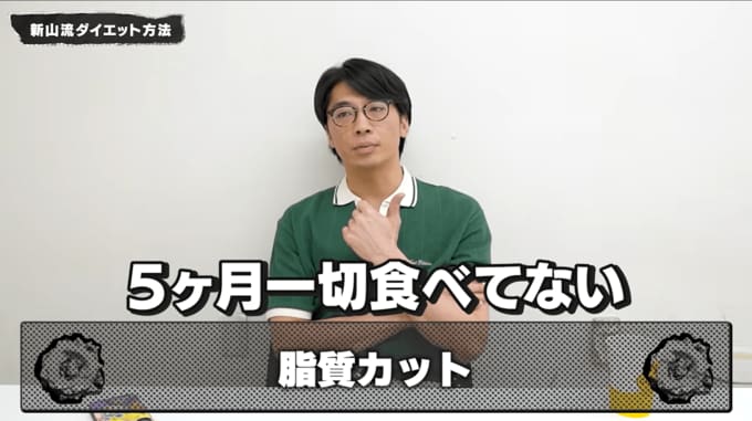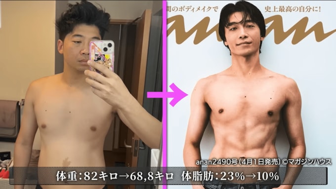 新山さんは〝体重82kgから68.8kgまでいった。体脂肪は23%から10%くらいまで落として〟と告白。〝基本ずっとやってたのは、脂質カット。揚げ物は5か月一切食べてないです。アルコールも、5か月で3杯くらい飲んだかな?くらい〟と、ストイックな食生活を明かしました。